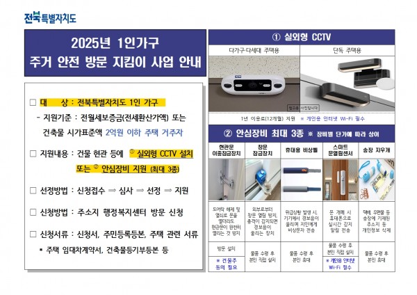 주거•안전 문제에 취약한 1인가구에게 주거안심 장비를 지원하여 심리적 불안을 해소하고 안전한 주거환경을 조성하고자 『1인가구 주거 안전 방문 지킴이』 사업을 아래와 같이 추진하오니 많은 관심 바랍니다.