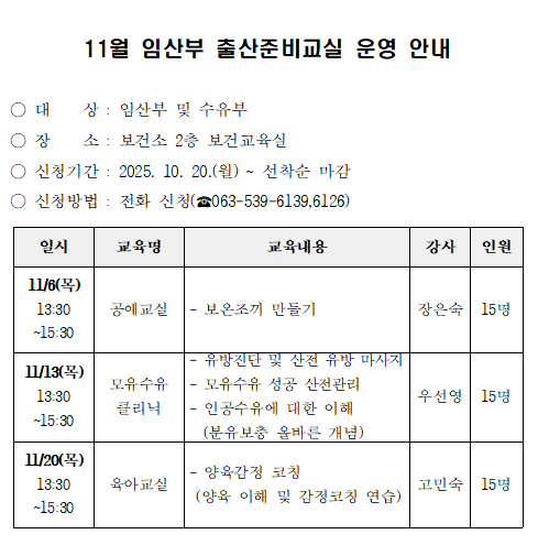 11월 임산부 출산준비교실 참여자 모집 안내