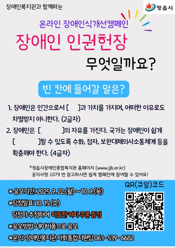 장애인종합복지관 [온라인 장애인식 개선 캠페인] 안내 페이지 정보 작성자 정읍지황융복합사업단 댓글 0건 조회 424회 작성일 25-09-23 10:11 목록 본문 장애인종합복지관 [온라인 장애인식 개선 캠페인] 안내 이전글2025년 대한민국 공공건축상 공모 안내 25.09.23 다음글청소년 세미 뮤지컬「깨어라, 너의 잠에서」 공연 안내 25.09.23 댓글 0 댓글목록 등록된 댓글이 없습니다.