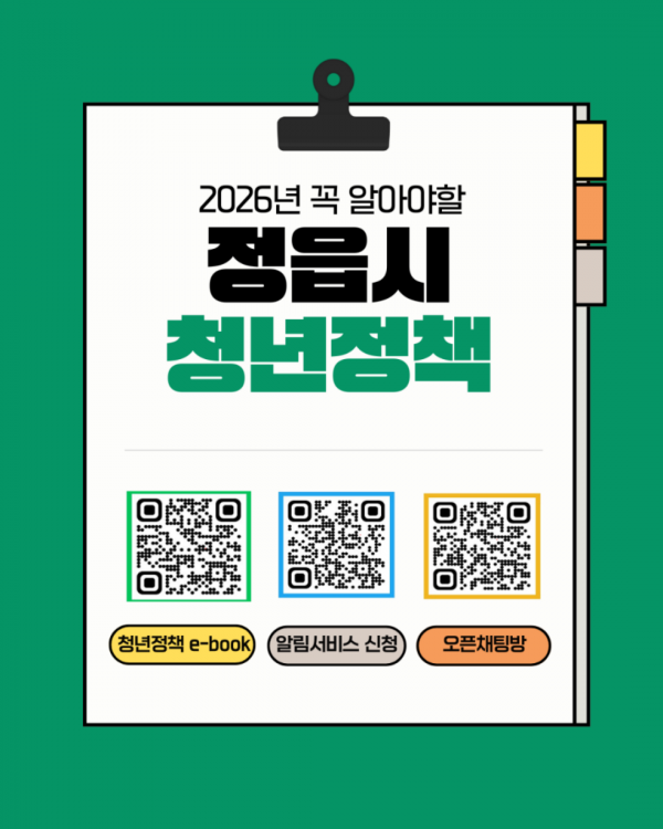정읍시 청년정책 종합 안내서 전자책(e-book) 및 알림서비스 이용 안내 페이지 정보 작성자 정읍지황융복합사업단 댓글 0건 조회 60회 작성일 26-01-14 09:05 목록 본문 이전글(정읍농관원)농업경영체 정기 변경신고제 홍보 및 유효기간 갱신 안내 26.01.16 다음글2026 도시, 농어촌 빈집정비(철거)지원사업 사업신청 안내 26.01.13 댓글 0 댓글목록 등록된 댓글이 없습니다.