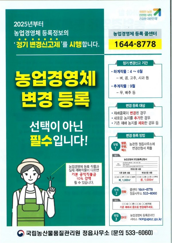 (정읍농관원)농업경영체 정기 변경신고제 홍보 및 유효기간 갱신 안내 페이지 정보 작성자 정읍지황융복합사업단 댓글 0건 조회 10회 작성일 26-01-16 09:17 목록 본문 . 다음글정읍시 청년정책 종합 안내서 전자책(e-book) 및 알림서비스 이용 안내 26.01.14 댓글 0 댓글목록 등록된 댓글이 없습니다.
