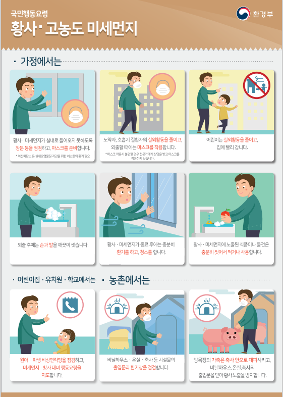 - 가정 : 실내 공기의 환기 및 황사에 노출된 물품 등은 세척 후 사용