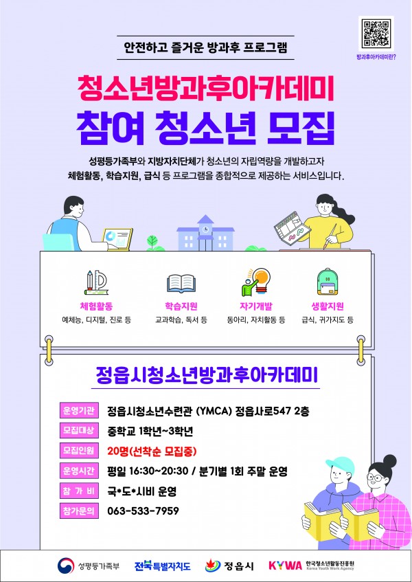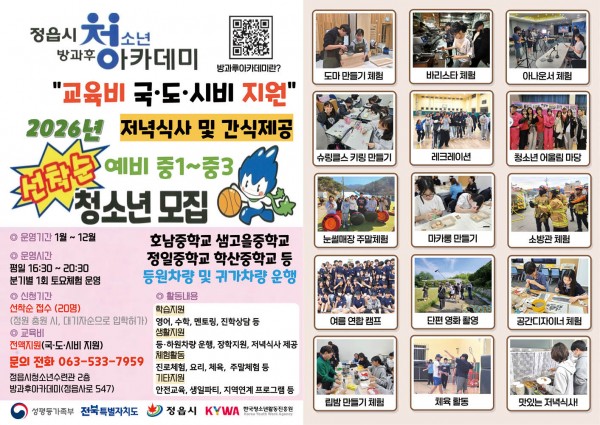 성평등가족부와 정읍시가 지원하는 정읍시청소년방과후아카데미에서 2026년 참여 청소년을 모집하고 있습니다.